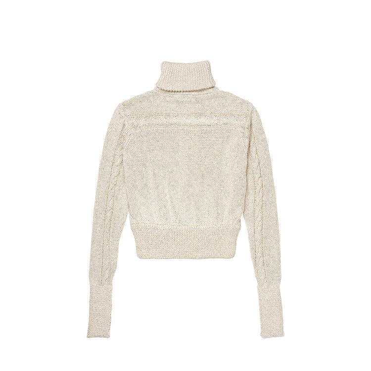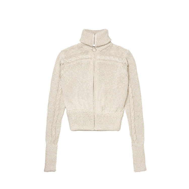Our Sui Cardigan is crafted from a light beige cotton blend. This cardigan has an oversized fit with knitted and ribbed detailing, complemented by a two way-zipper.
