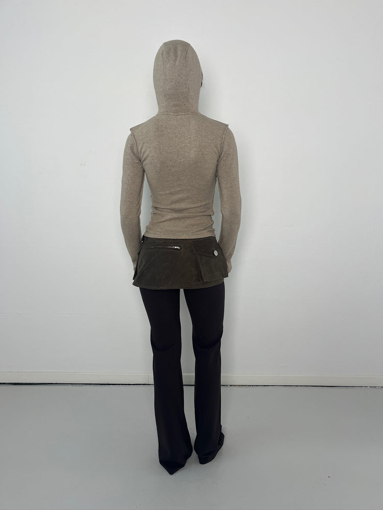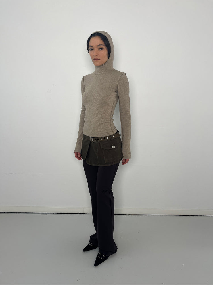 Our Vitus Hoodie with a high neck and hood. Crafted from a dense, knitted blend featuring beige cashmere and wool. This fitted design features exposed seams and subtle KM embroideries.