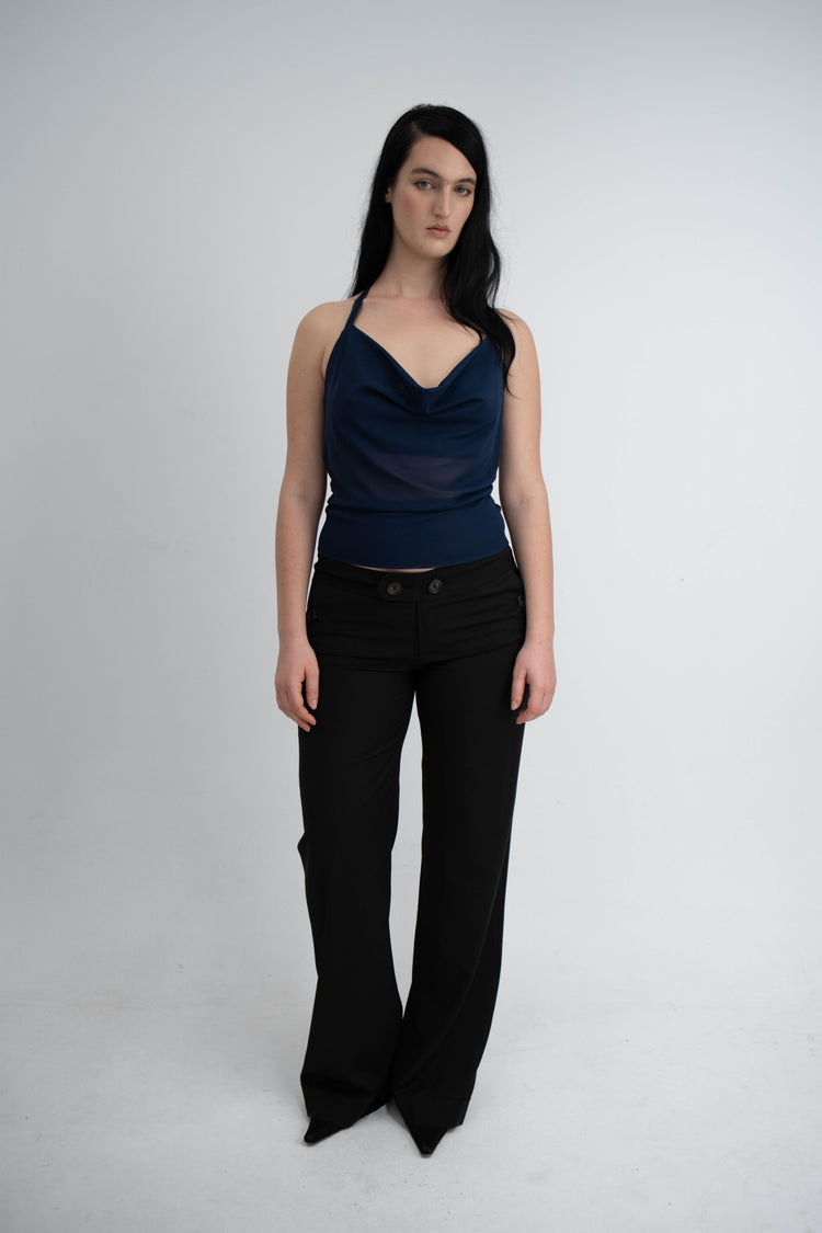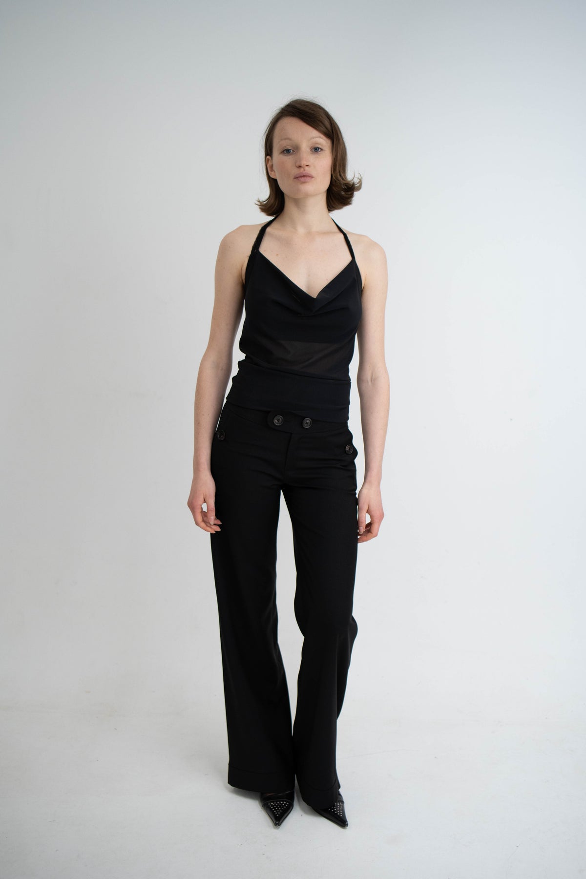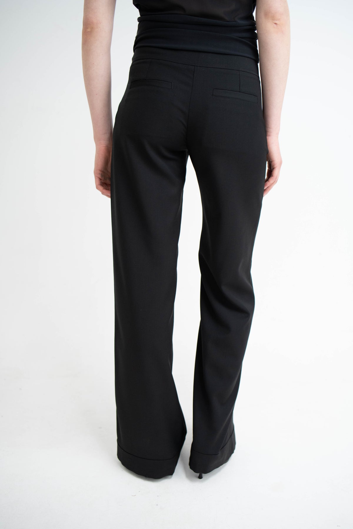 Our Jenni Pants are crafted from black wool fabric. They feature a low-waist fit with straight legs, complemented by refined stitching and button detailing.