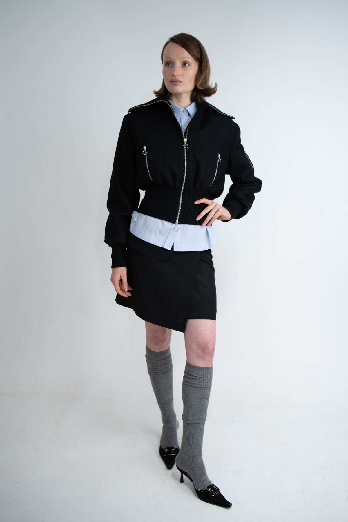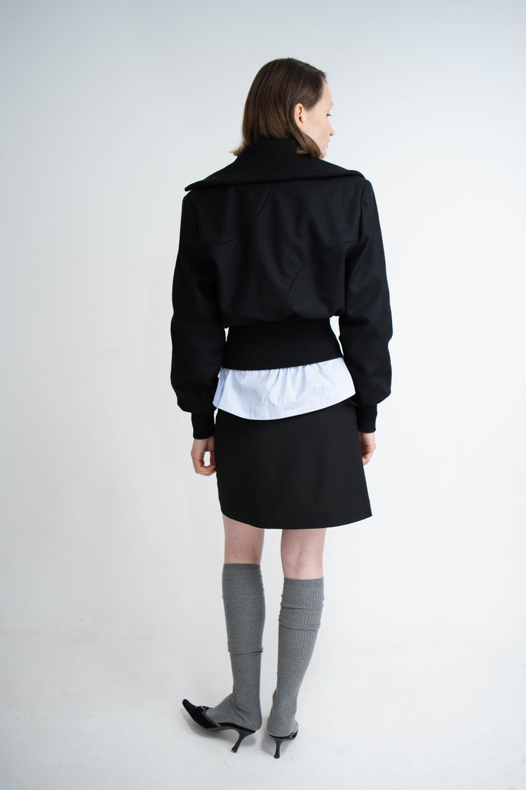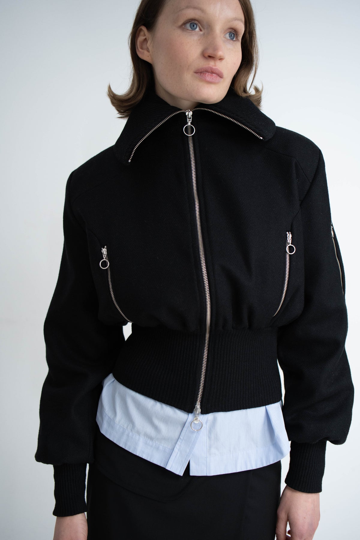 Jet bomber in a black deadstock wool fabric. This jacket features a slightly cropped fit with an oversized silhouette, two side pockets, a sleeve pocket, and a two-way front zipper.