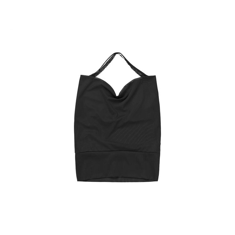 Our Katara top is crafted from a black mesh fabric. It features a halterneck design with two elastic straps, one accented with a lace detail. The top has a waterfall drape at the front, creating an organic texture.