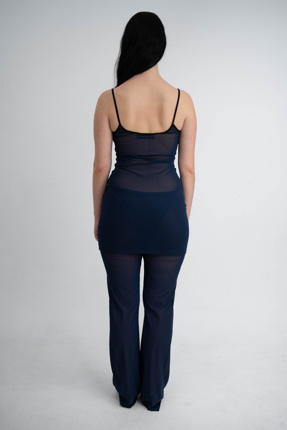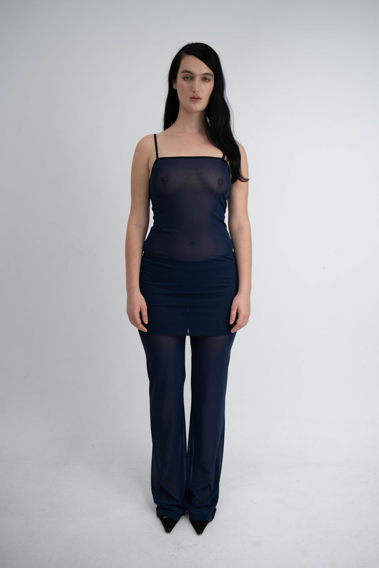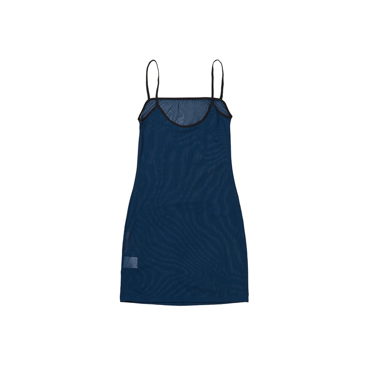 Our Lula Dress in a midnight blue mesh quality. This dress has a tight fit with a deep back and comes with thin black elasticated straps.
