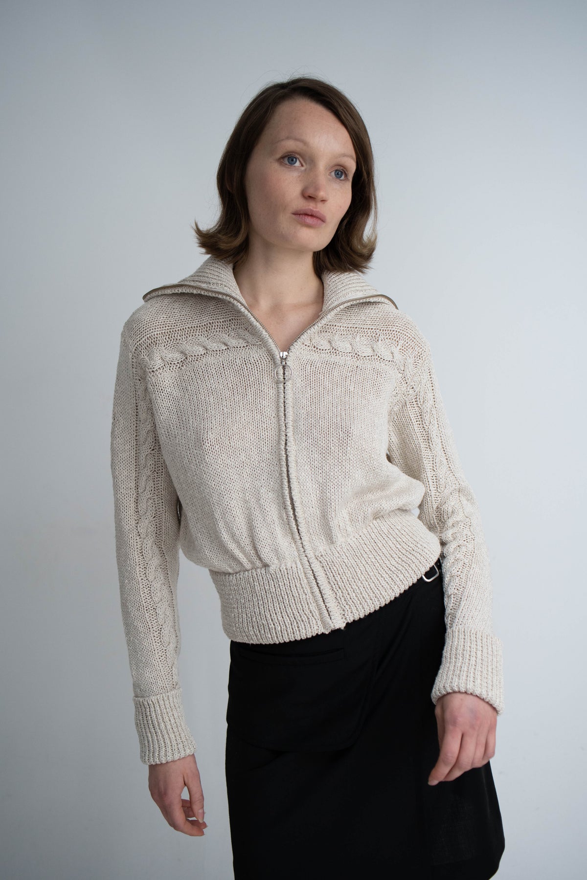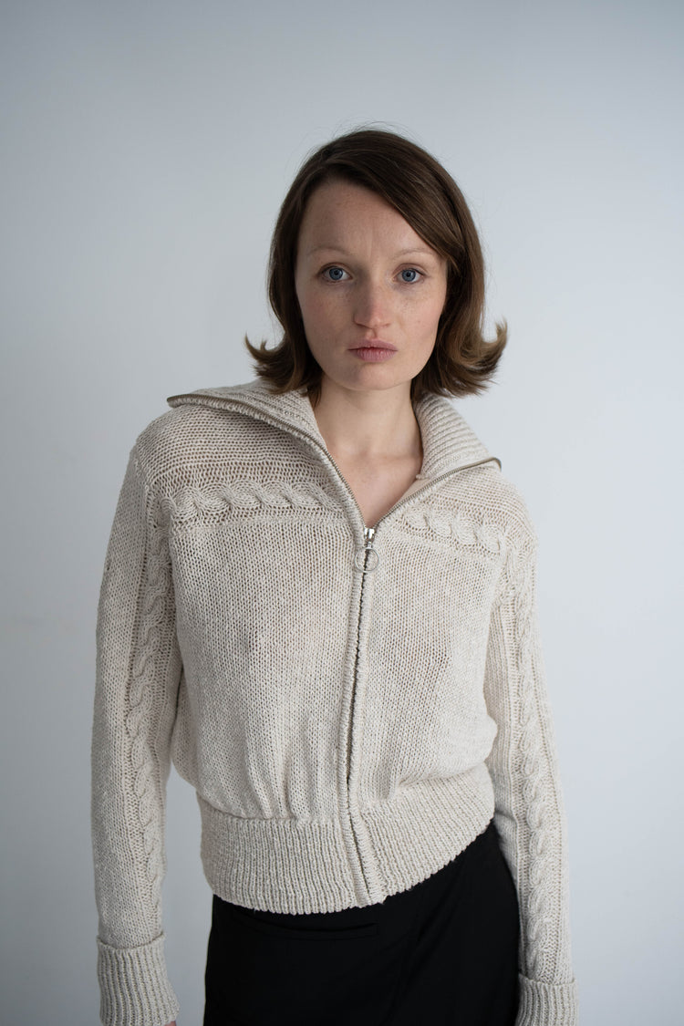 Our Sui Cardigan is crafted from a light beige cotton blend. This cardigan has an oversized fit with knitted and ribbed detailing, complemented by a two way-zipper.