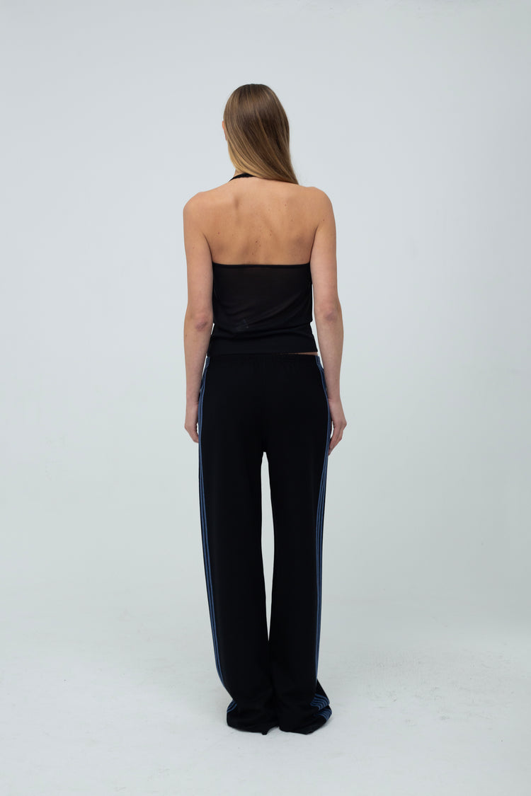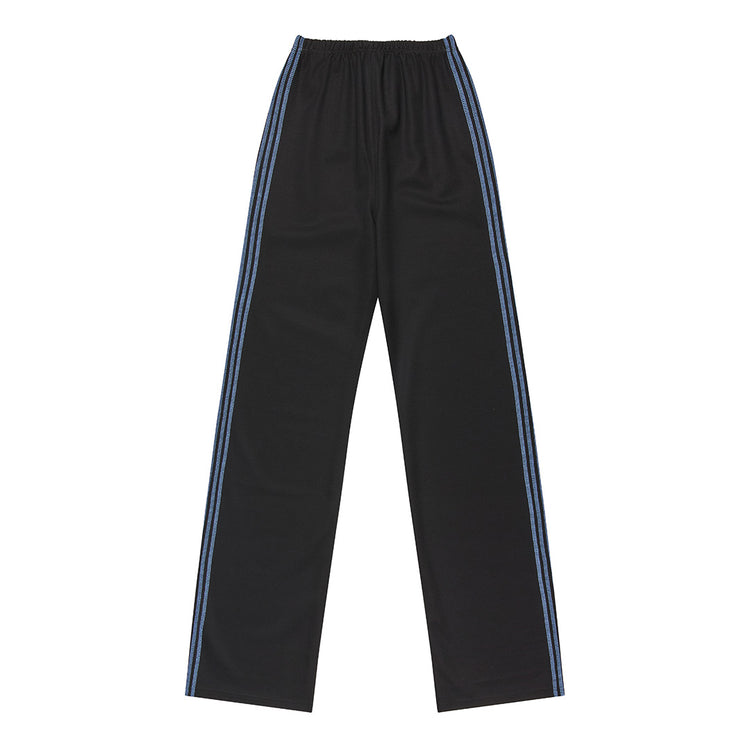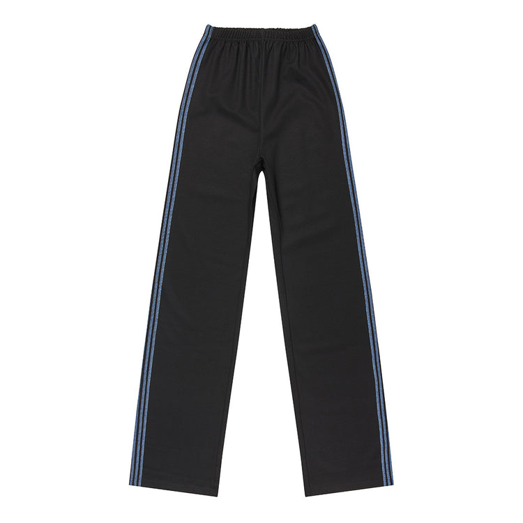The Ziggi Track Pants are straight, loose-fitting pants featuring blue coverlock stripe detailing along the sides. The pants are crafted from a dense jersey fabric in black.