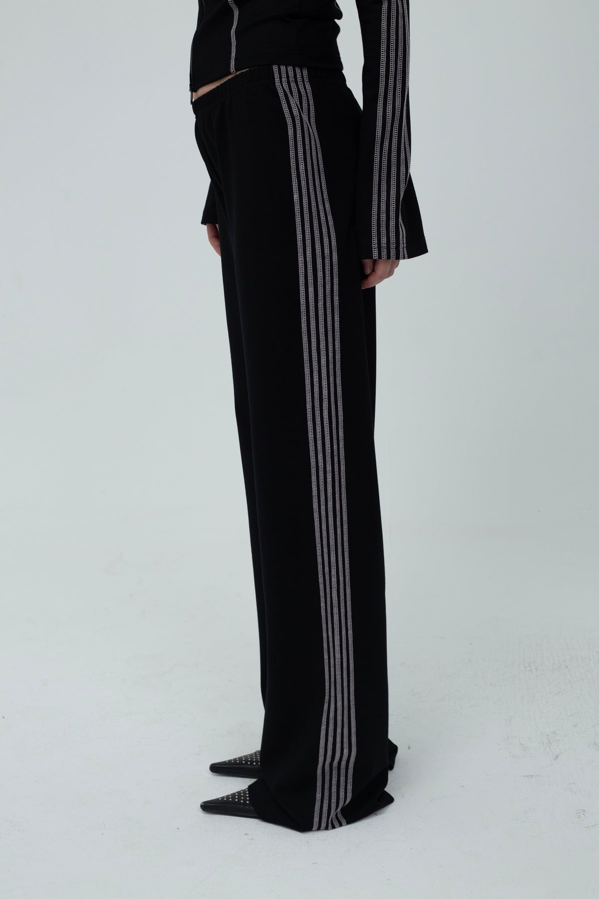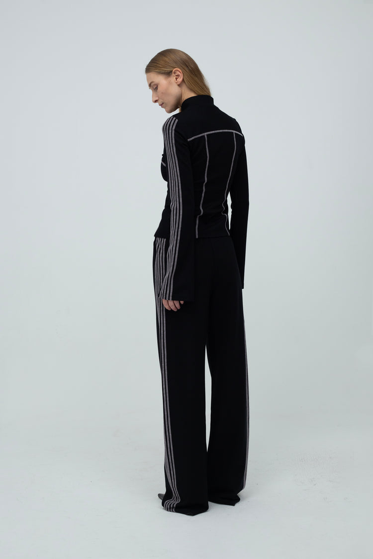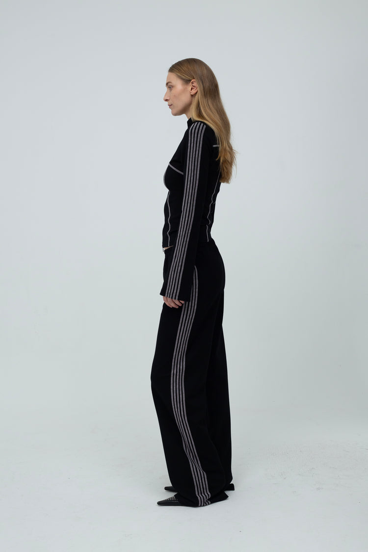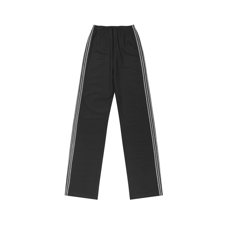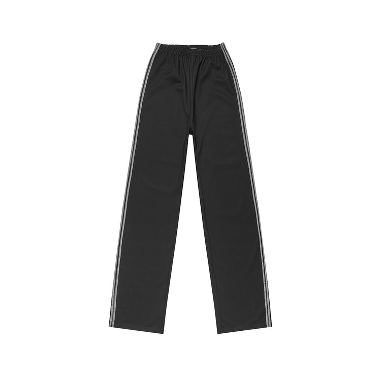 The Ziggi Track Pants are straight, loose-fitting pants featuring light pink coverlock stripe detailing along the sides. The pants are crafted from a dense viscose fabric in black.