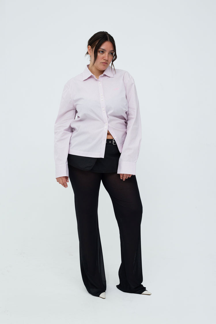 The Alexandra Shirt is an oversized shirt featuring asymmetric button detailing. The shirt is crafted from cotton fabric in a light pink striped colorway.