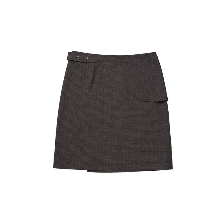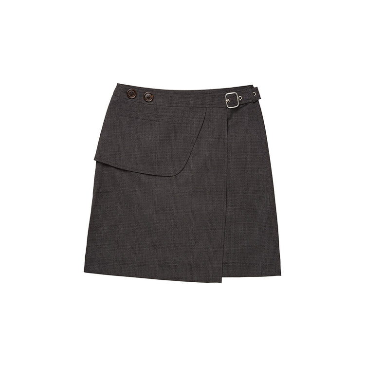 The Alia Skirt is a midi-length skirt featuring an adjustable belt with a wrap closure. It is crafted from a wool blend in grey/black.