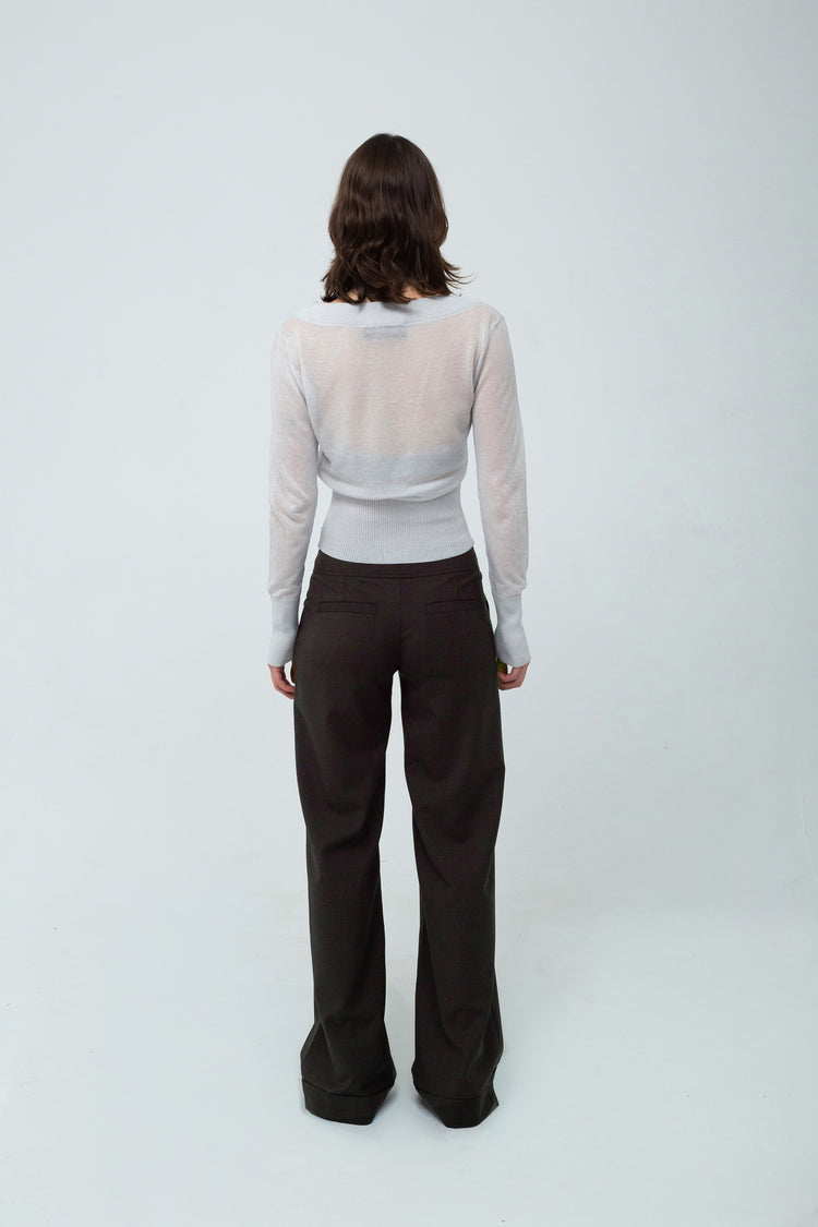 The Sima V-Neck is a fitted blouse, contrasted by ribbed detailing at the cuffs and hem. The v-neck is crafted from a lightweight knitted fabric in silver.