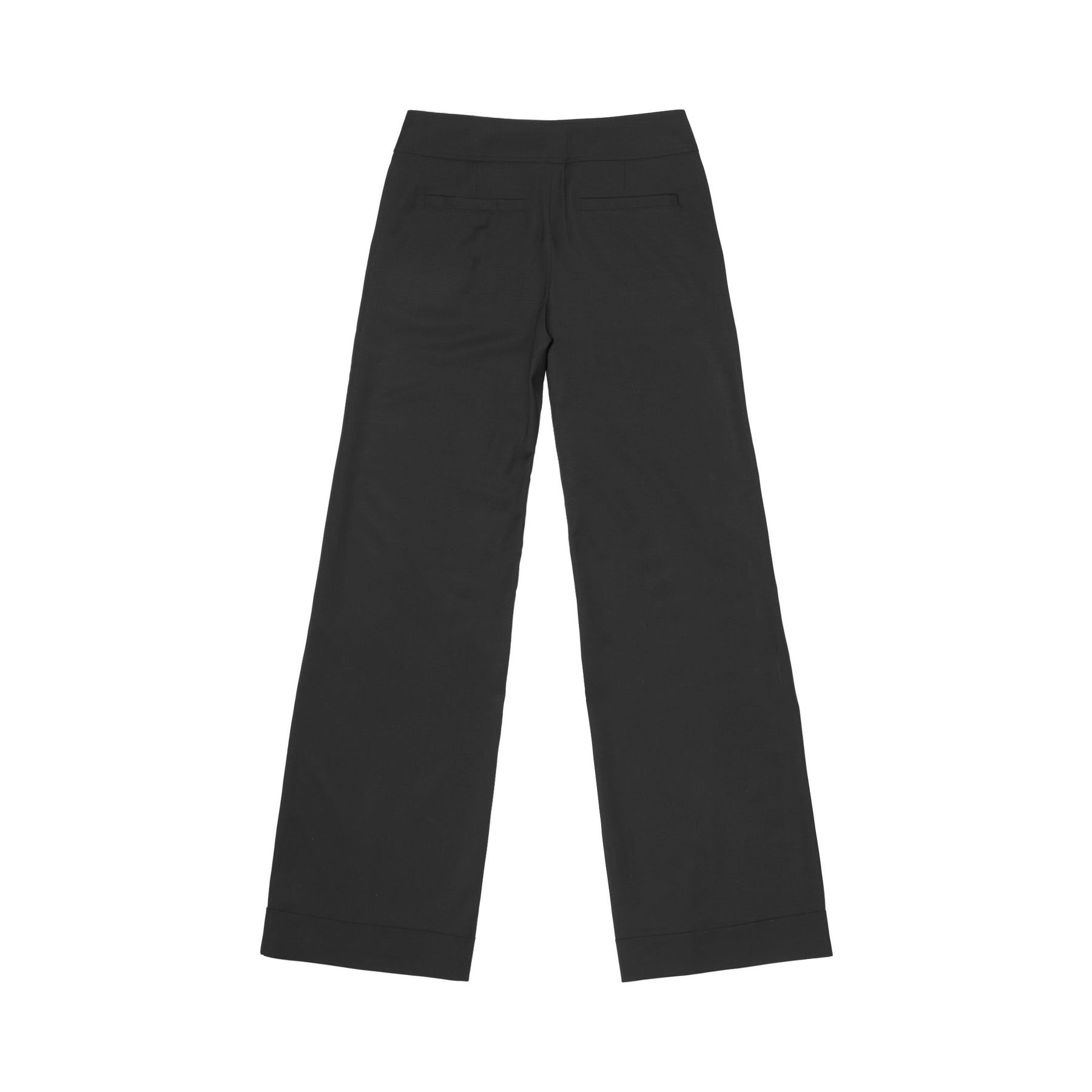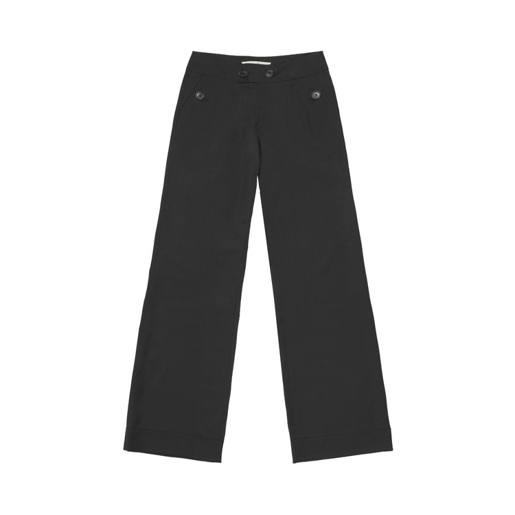 Our Jenni Pants are crafted from black wool fabric. They feature a low-waist fit with straight legs, complemented by refined stitching and button detailing.