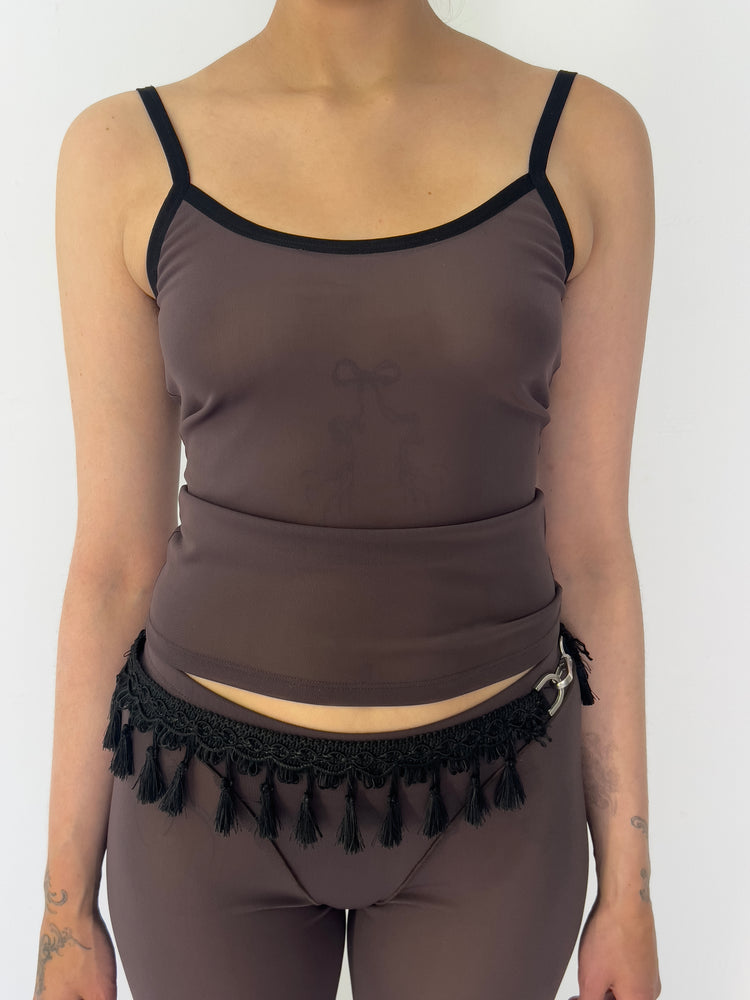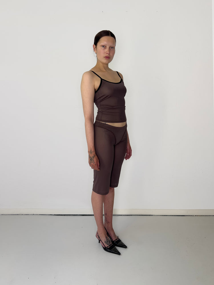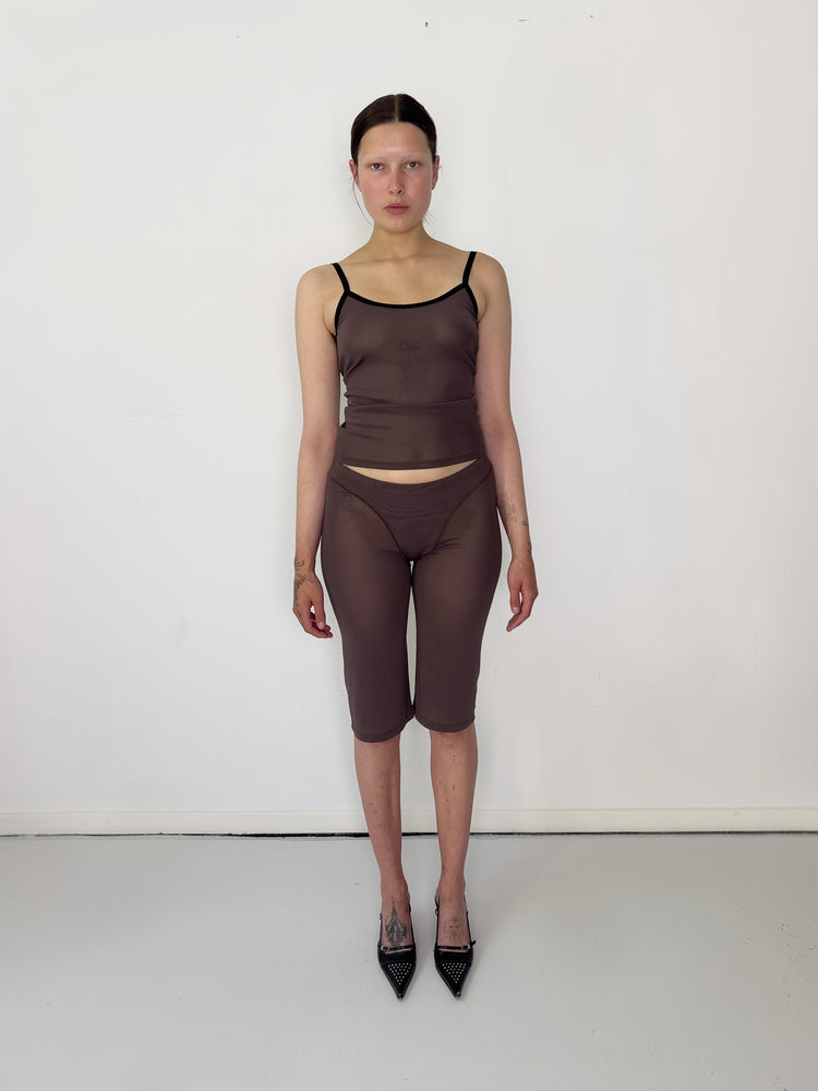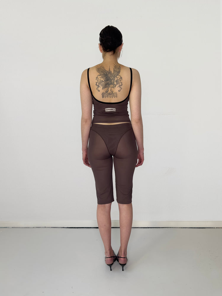 Our Woody Tights crafted from a brown mesh fabric. These tights offer a body-embracing fit with a knee length silhouette. The design features an underwear-like imitation framed by a subtle babylock seam. Also these tights have a subtle see through detailing on the legs.