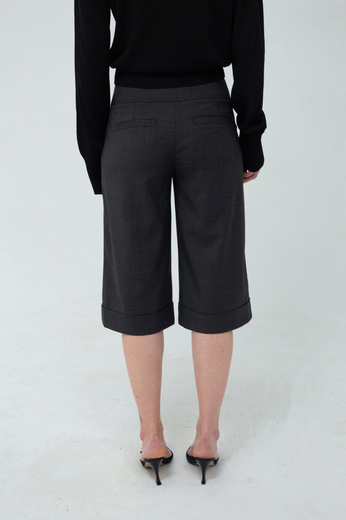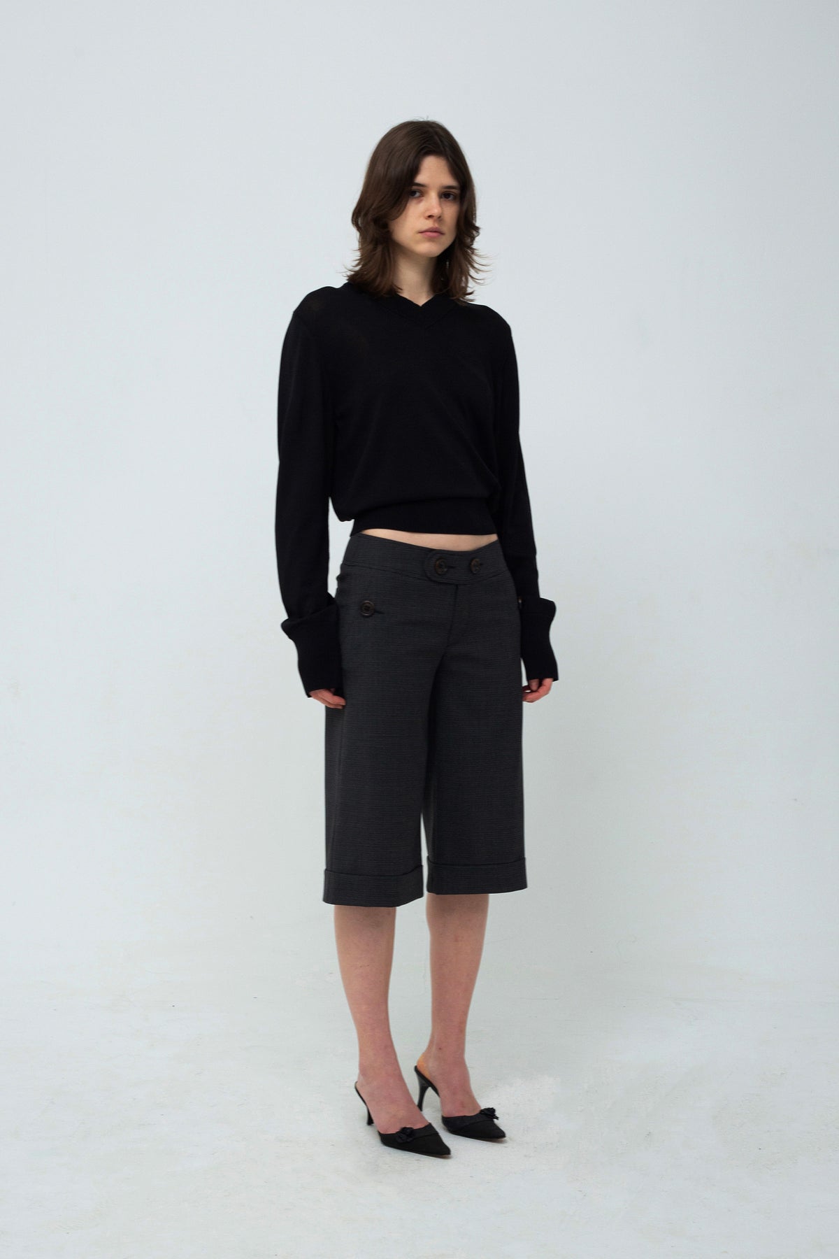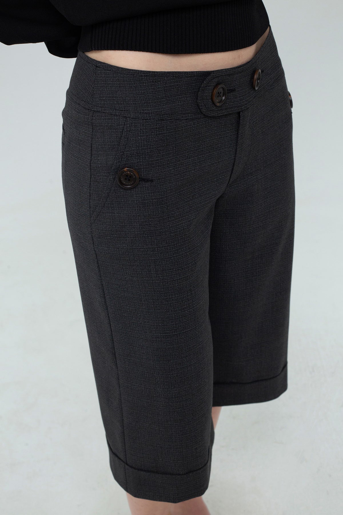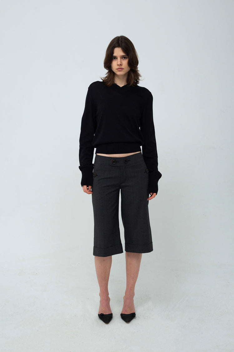 The Poula Shorts are low-waisted, straight-leg shorts featuring button detailing. They are crafted from wool blend in grey/black.
